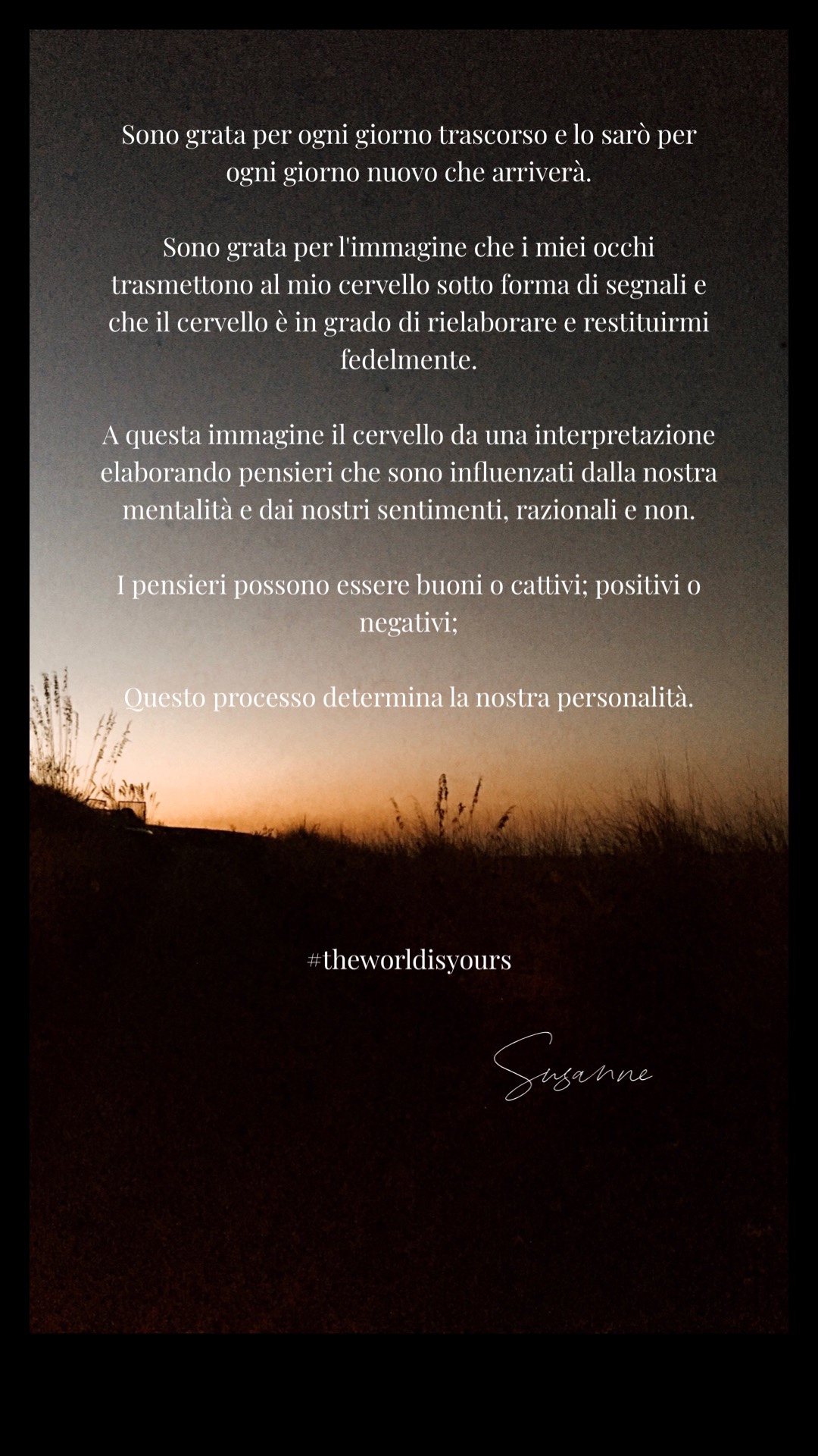 Quando nella vita comprendi che non è poi tutto così scontato ma scopri che le naturali e straordinarie capacità che possiedi sono in realtà un grande dono e miracolo della vita, ti accorgi allora che non puoi perderti tutta la felicità che meriti. I nostri pensieri e quelli degli altri potrebbero condizionarci, ma la realtà spesso è un’altra. #worldisyours